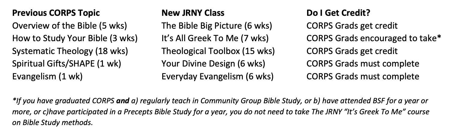 CORPS Credit: If you have completed CORPS AND have a) a year or more of BSF, or b) a year or more of Precepts Bible Study, or c) have been a CBC teacher in Community Groups, you do not need to take this course.
